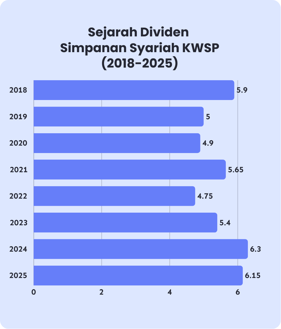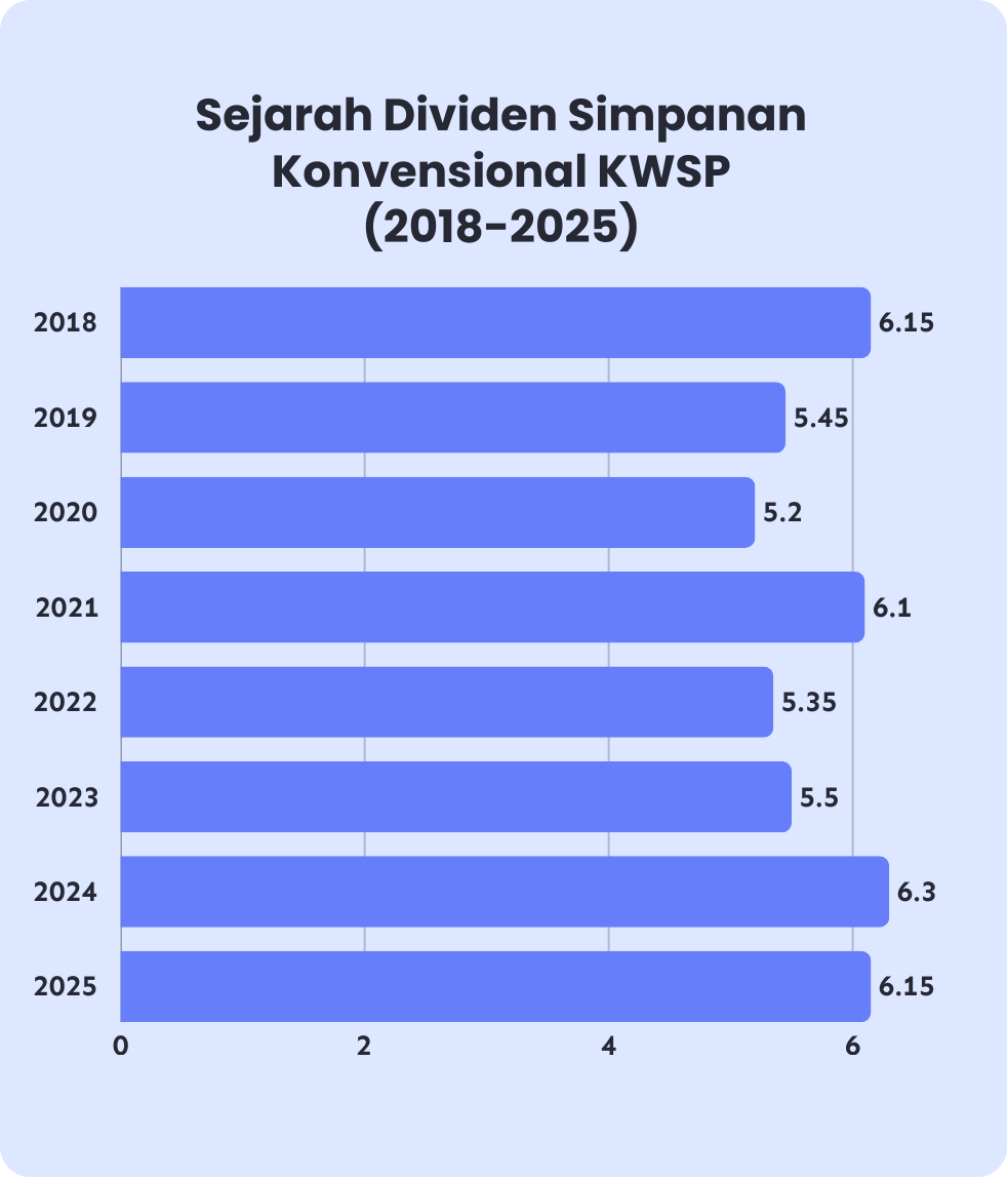 Pada 28 Februari 2026, KWSP mengumumkan dividen 6.15% bagi simpanan Konvensional dan Syariah untuk tahun kewangan 2025, berjumlah rekod pembayaran sebanyak RM79.6 bilion. Walaupun sedikit rendah berbanding kadar 6.30% pada tahun 2024, agihan ini kekal antara yang tertinggi dalam tempoh lima tahun, mengatasi kadar simpanan tetap semasa dengan ketara.