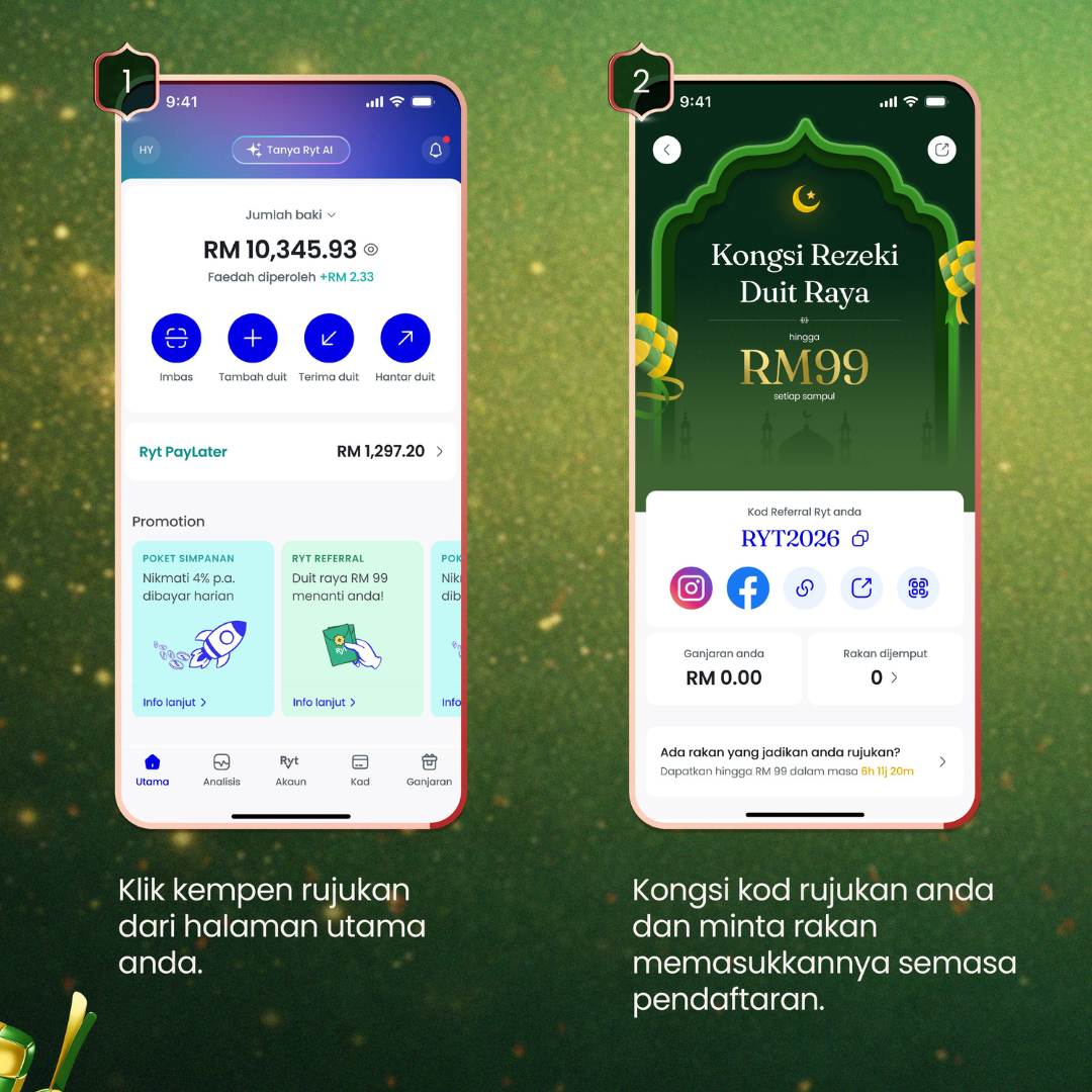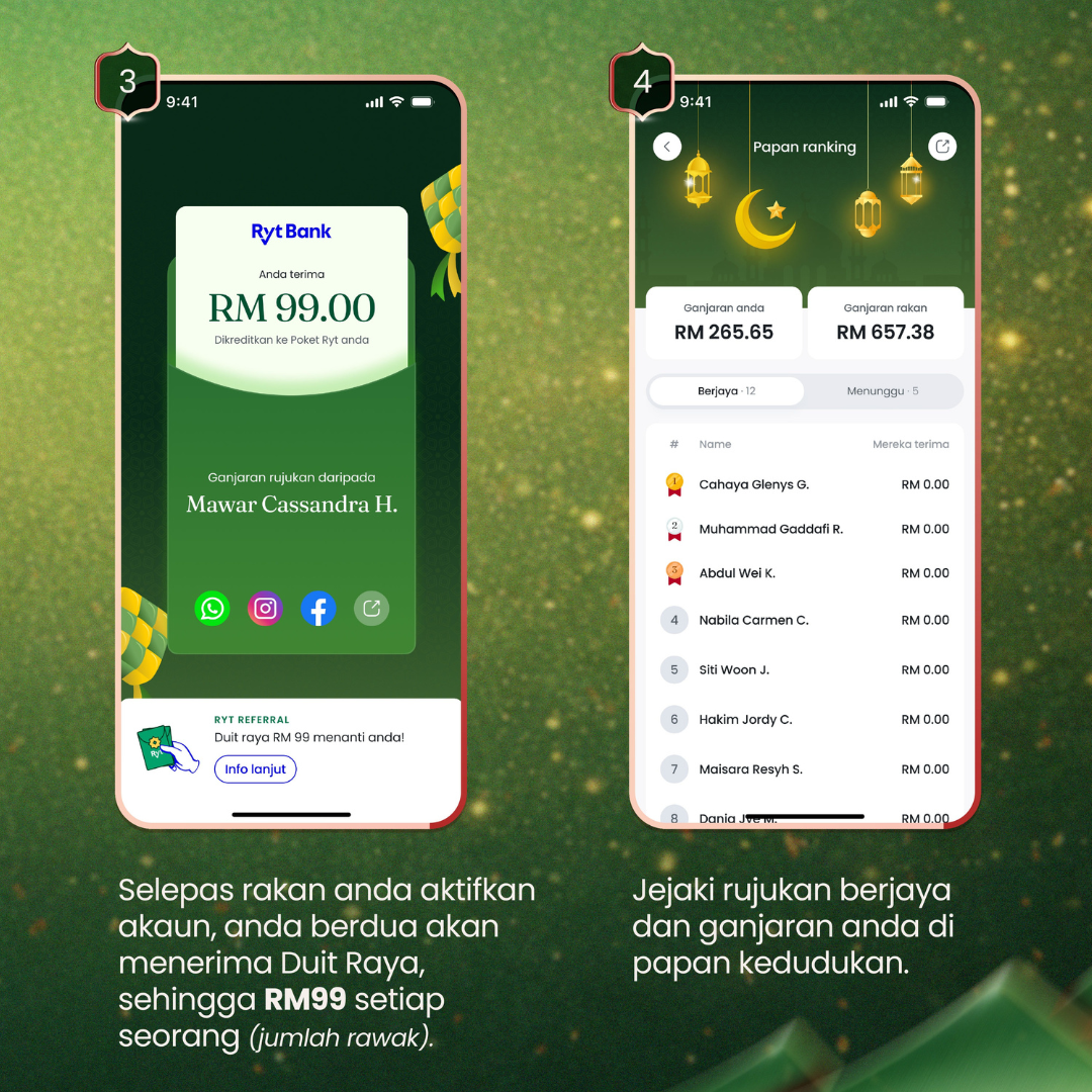 Inisiatif ini direka untuk mencerminkan semangat sebenar Aidilfitri dengan menggalakkan perkongsian bersama keluarga dan rakan-rakan, dan bukan sekadar menawarkan ganjaran pendaftaran sekali sahaja. Pelanggan hanya perlu berkongsi kod rujukan peribadi melalui aplikasi Ryt Bank, dan kedua-dua pihak akan menerima Duit Raya selepas akaun berjaya diaktifkan.
