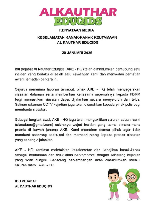 The headquarters of Al Kauthar Eduqids has initiated an internal investigation after several videos showing staff members allegedly abusing children went viral on social media. The management confirmed that the involved staff have been suspended and an official channel for parental complaints has been established. They expressed deep regret over the incident and pledged full cooperation with the police.
