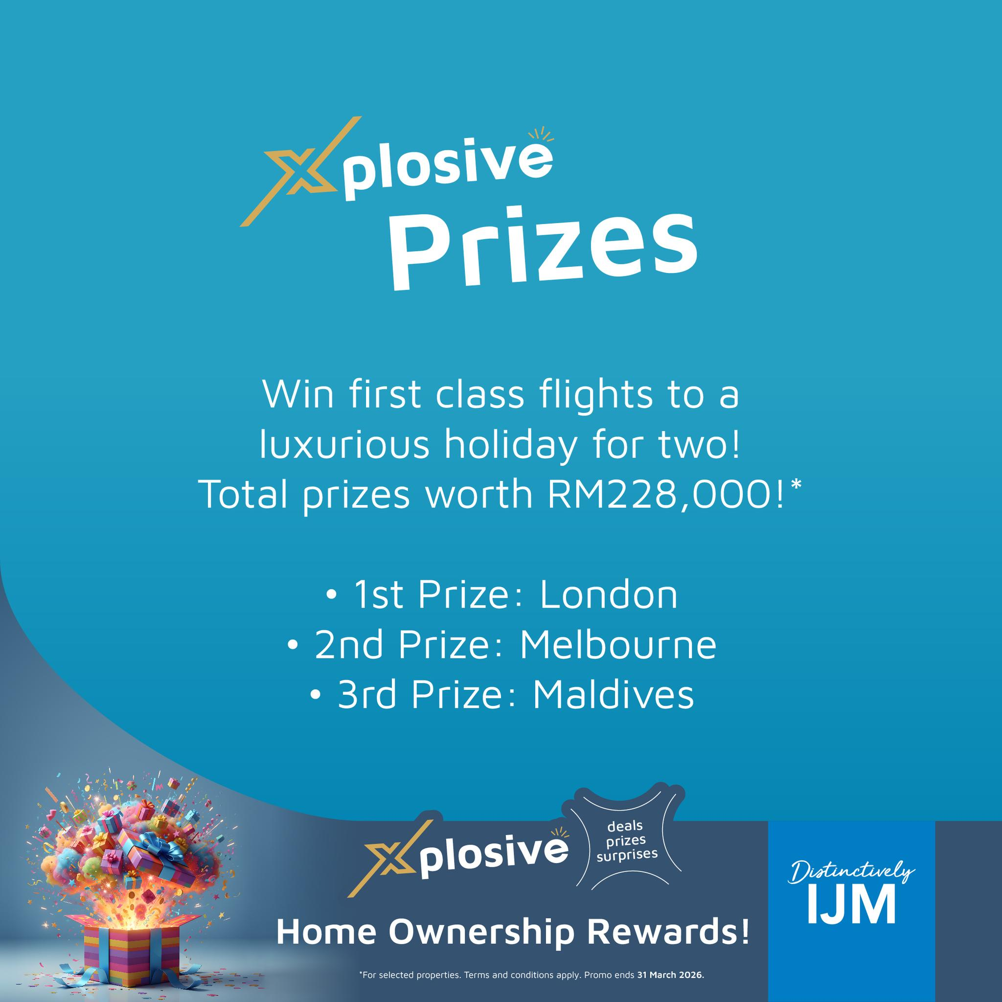 As an added incentive, eligible homebuyers who sign their SPA within the stipulated timeframe shall be entitled to participate in the XPLOSIVE Prizes contest, where they stand a chance to win first-class flights to a luxurious holiday for two to London, Melbourne and the Maldives, worth a total of RM228,000*.