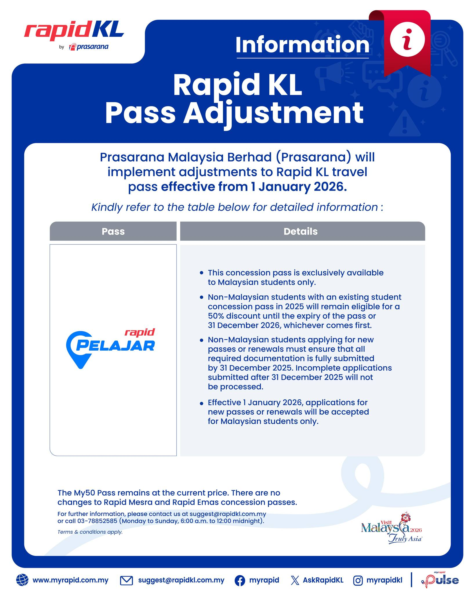 The popular My50 pass, which offers 30 days of unlimited travel exclusively for Malaysians, remains unchanged at RM50. Concession passes for targeted groups are also maintained. This includes 'Rapid MESRA' (unlimited free rides for registered OKU) and a 50% discount for both 'Rapid PELAJAR' (Malaysian students) and 'Rapid EMAS' (Malaysian senior citizens).