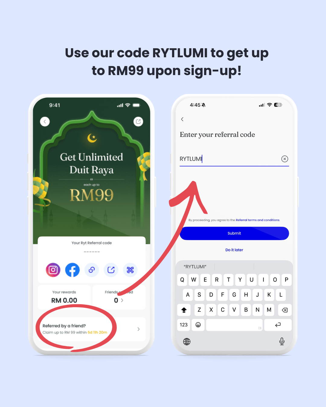 Make sure to enter RYTLUMI in the 'Referral Code' field to claim your Duit Raya worth up to RM99. Then, share your unique referral code with friends to earn even more Duit Raya!
