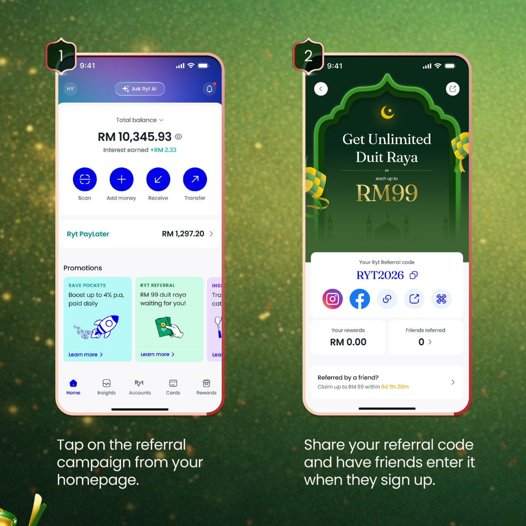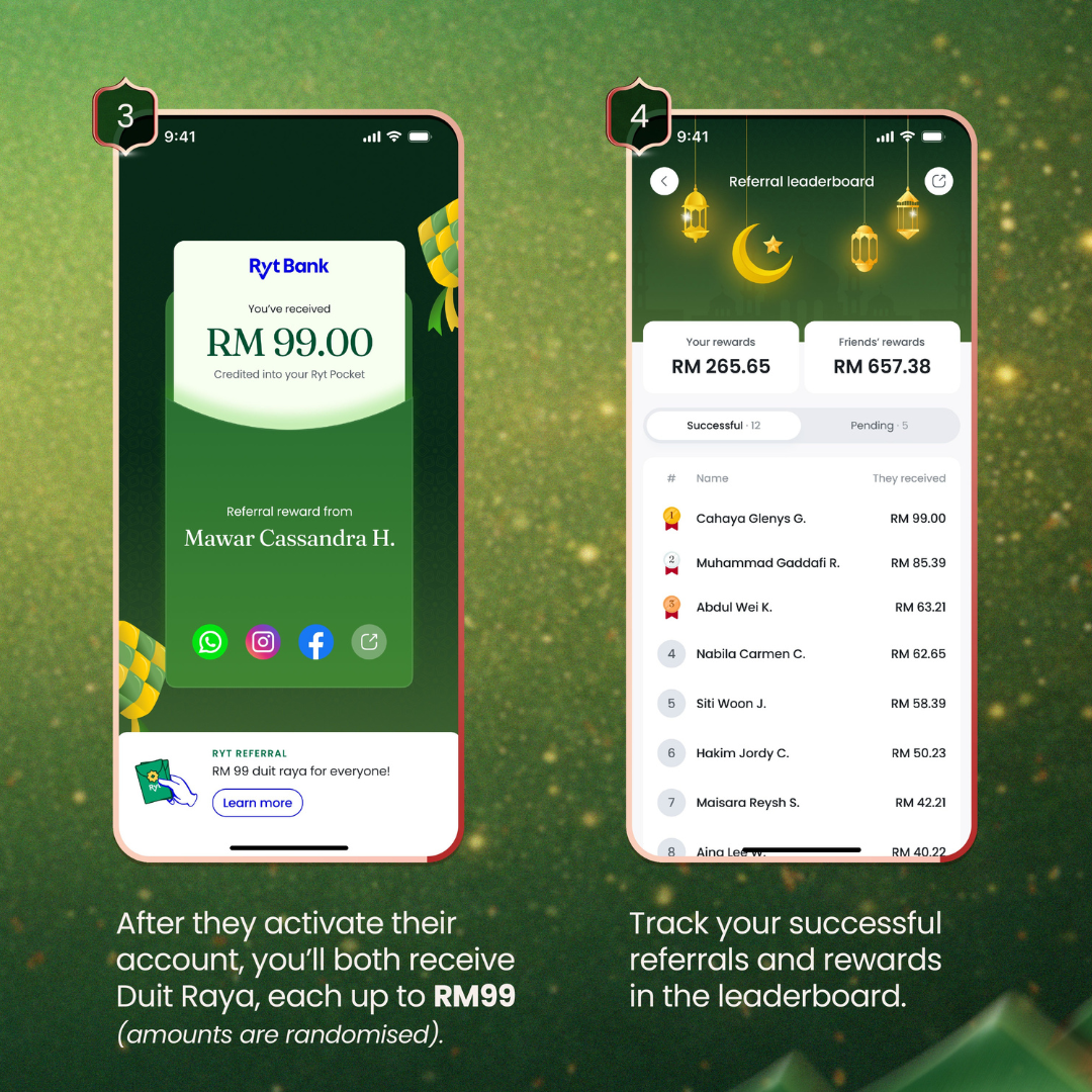 Building on the strong momentum from CNY, Ryt Bank is introducing a larger-scale Duit Raya referral initiative, where both referrers and new customers receive digital Duit Raya worth up to RM99 per successful sign-up — higher than the RM88 offered during Chinese New Year.