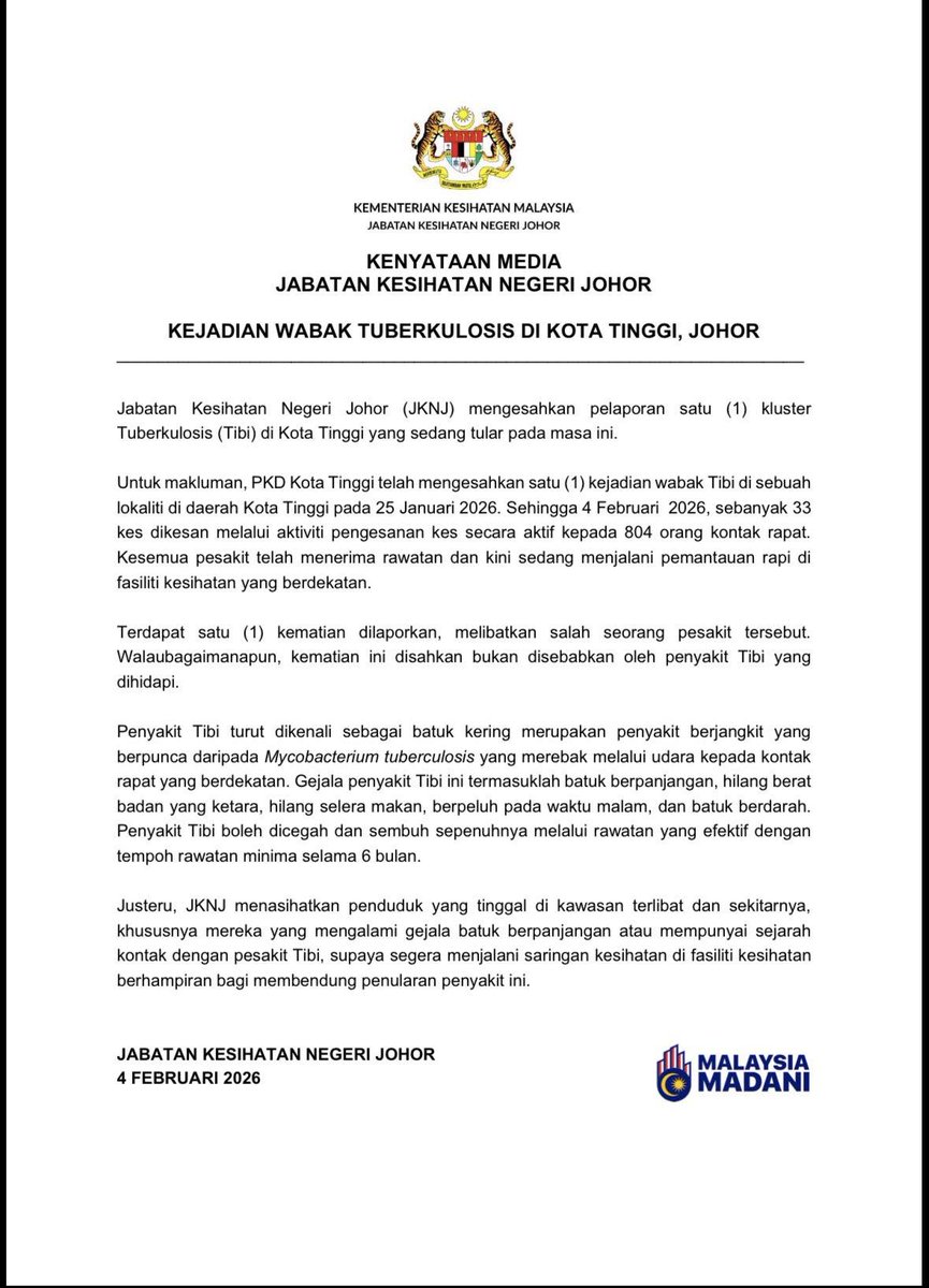 柔佛州爆发结核病(肺结核),在短短三个月内有33人被诊断感染。来了解结核病的症状与预防方法 👇